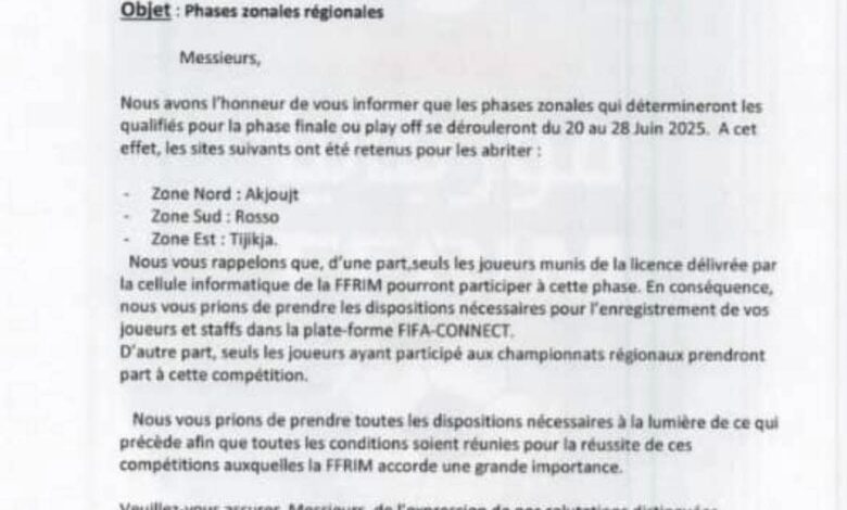 كشف الاتحاد الموريتاني لكرة القدم، اليوم 10 يونيو 2025، عن البرنامج الرسمي للتصفيات الجهوية المؤهلة للمرحلة النهائية من منافسات البلاي أوف، والتي ستُقام في الفترة ما بين 20 و28 يونيو الجاري.